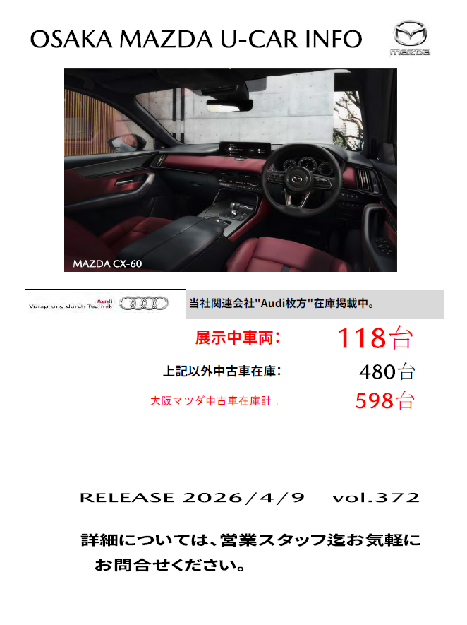 大阪マツダグループの中古車在庫情報「大阪マツダU-CAR INFO」 2026年4月9日発行分では598台が掲載されています。