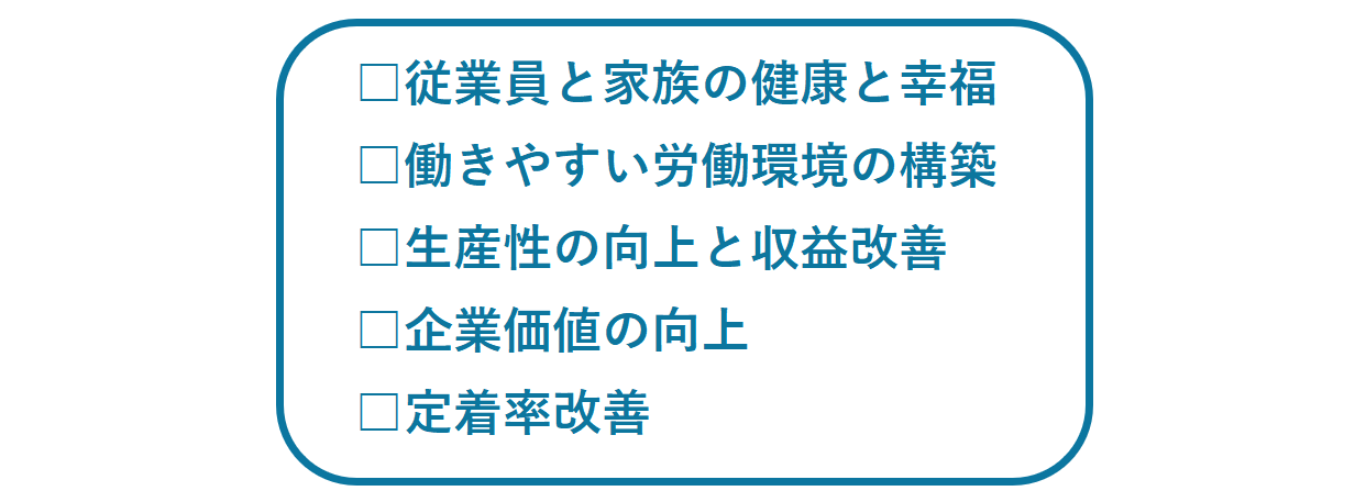 | 健康経営推進チーム | 具体的な取り組み立案と実施 問題点や課題の検証 結果の収集と報告 相談窓口(メンタルヘルスと育児・介護)の設置 健康管理・労務管理 社外機関との連携・協力体制 |