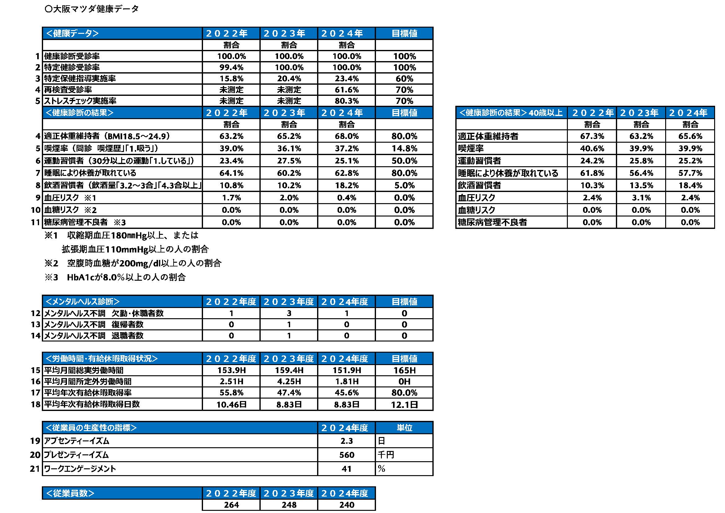 当社は健康宣言実現の為、下記項目を課題とし、取締役会、健康経営推進チームを通じ推進状況や課題の共有と更なる改善に取組みます。