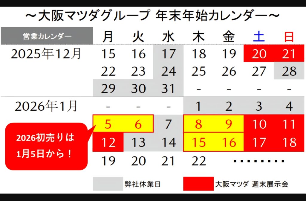 😂【年末年始のご案内】大阪マツダ交野店、12/15~『ザ・プレ初売り!2026』開催中です😁