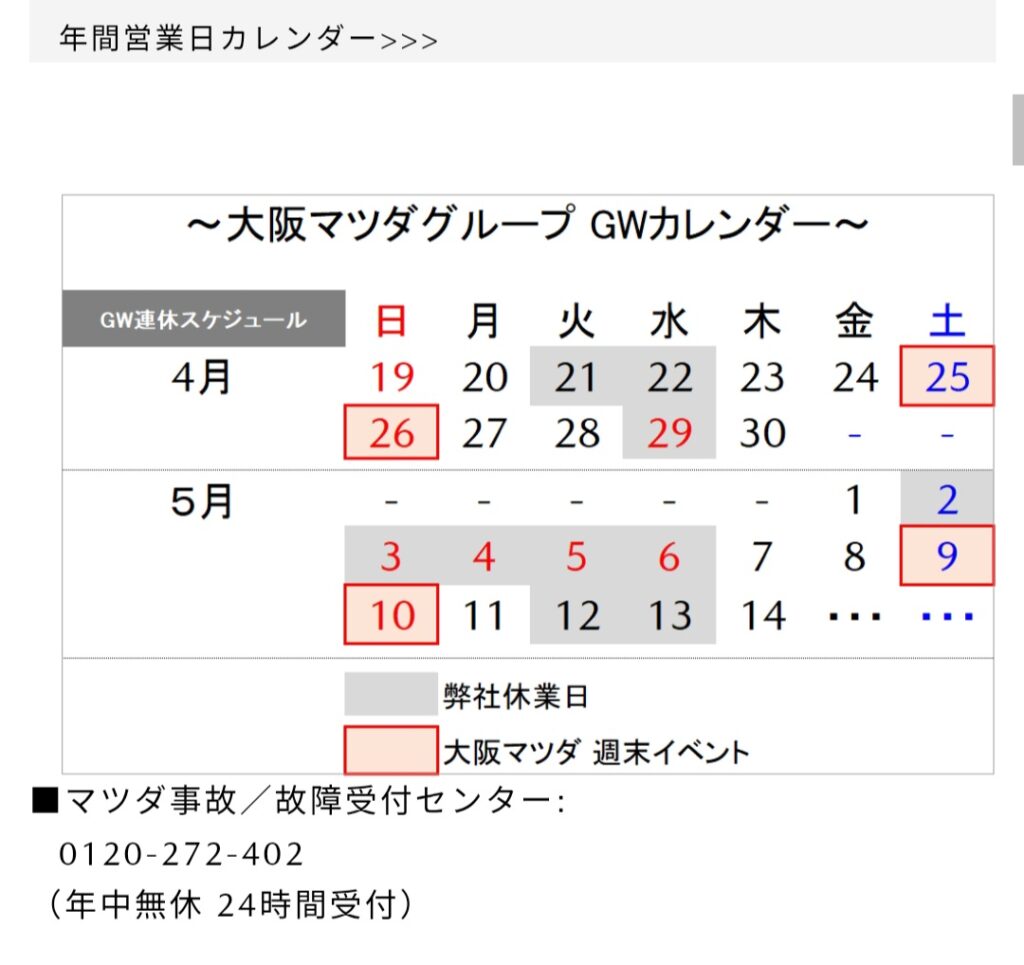 店舗店休日期間でのお車のお困りごとは『マツダ事故故障受付センター』→0120-272-402、