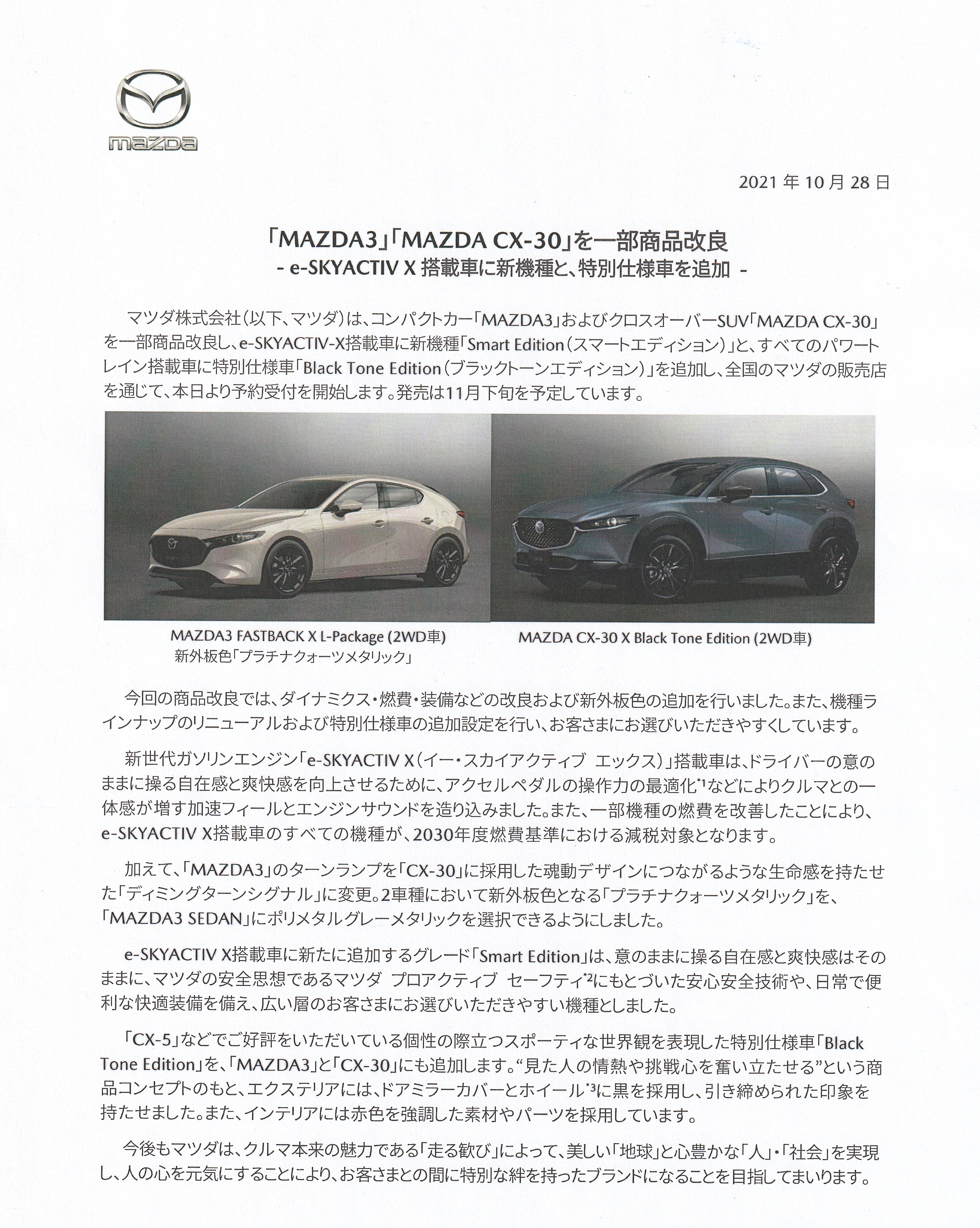 10月30(土)31日(日)CX-30・MAZDA3発表会をおこないます。 まだ現車はございませんが、カタログはございます。 成約特典もご用意しておりますので、ご来店ください。